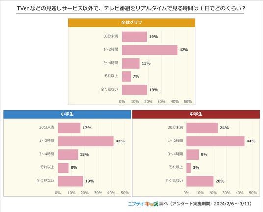 小中学生の中で、リアルタイムでテレビ番組を見る時間は「1~2時間」が42%で1位、続いて「30分未満」が19%で2位と、テレビ番組を配信以外で見る時間は比較的少ないようです。テレビ番組よりもYouTubeなどの動画配信サービスを視聴する小中学生の方が多いことがわかりました。