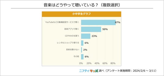 87%の小中学生が、「YouTubeなどの動画配信サービス」で音楽を聴いています。2位の「音楽アプリ」の50%よりも大幅に多く、大半の人が動画配信サービスを利用しているようです。配信サービスやアプリに比べて、「CDやDVDを買う」「レンタルショップで借りる」人は少ない結果となりました。