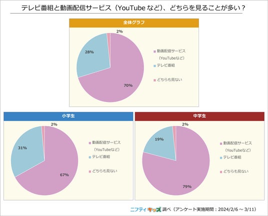 小学生では67%がテレビよりも動画配信サービスを視聴していることがわかりました。中学生になると割合が79%まで上がり、約8割の人がYouTubeなどの配信サービスを視聴しています。