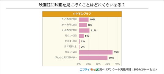 「年に1~2回」と回答した小中学生が最も多く、次いで多かったのは「ほとんど見に行かない」でした。多くの映画は、映画公開から少し待てば動画配信サービスで配信されるため、わざわざお金を出して映画館に行かなくてもいいという考えがあるのかもしれません。