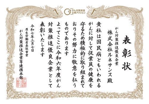 株式会社ルネサンス(代表取締役社長執行役員:岡本 利治、本社:東京都墨田区、以下「当社」)は、厚生労働省が推進する「がん対策推進企業アクション」において、令和6年度「がん対策推進優良企業」として表彰されたことをお知らせいたします。当社は今回が2回目の受賞となります。