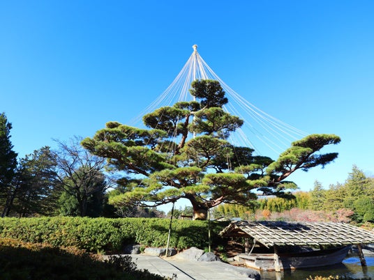 庭園内のアカマツに「リンゴ吊」と呼ばれる方式で施されており、高く伸びた支柱から枝へ放射状にワラ縄が張られています。雪の降る地域では、積雪の重みで枝が折れないよう樹木を保護するものですが当公園では、この時期だけの美しい冬景色としてお楽しみいただいています。