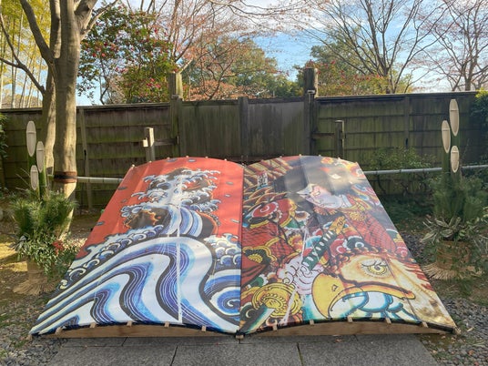 今年は鍾馗(しょうき)様や金太郎などが描かれた凧4枚を、日本庭園内の芝生広場と東門の2箇所に展示しました。これらの凧の絵柄は縁起物として昔から親しまれてきたもので、日本庭園の雰囲気にぴったりです。見て楽しんでいただけるほかに、写真スポットとしてもご利用いただけます。縁起物の凧の前で、大切な方とお写真を撮られてみてはいかかでしょうか?