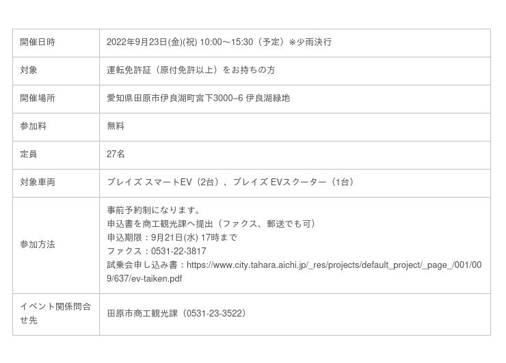 株式会社ブレイズ(愛知県名古屋市、代表取締役:市川秀幸、以下ブレイズ)は、2022年9月23日(金)(祝)に愛知県田原市の伊良湖緑地で開催される「伊良湖フードフェスタ2022・EVモビリティ体験試乗会」に、電動バイク ブレイズ スマートEV、ならびにブレイズ EVスクーターを提供し、ご来場の皆様の電動バイク体験試乗を支援いたします。