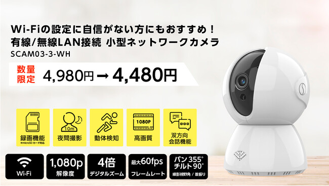 Wi-Fiの設定に自信のない方も簡単に接続可能 有線/無線LAN接続 小型ネットワークカメラ FG-SCAM03-3-WH 【数量限定】セール価格4,480円(税込) ← 通常価格4,980円(税込)