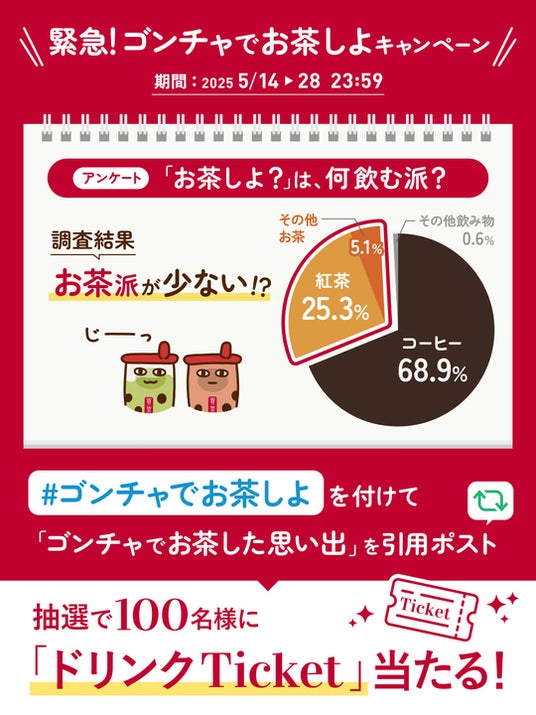この現状を受けて、My Gong chaをきっかけにティーカフェ文化をさらに広げ、“お茶を飲む”機会を増やすことを目指し、「“お茶しよ?”=お茶派」の声を集める「緊急!ゴンチャでお茶しよ?キャンペーン」を5月14日(水)より、公式Xにて開催します。