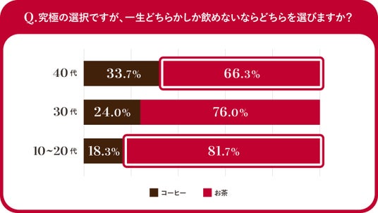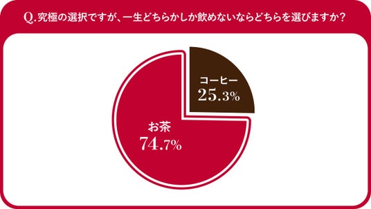 同様に『究極の選択で、一生「お茶」か「コーヒー」のどちらかしか飲めないならどちらを選ぶか』を聞いたところ、25.3.%が「コーヒー」、74.7%が「お茶」と回答。「お茶しよ?」の質問とは対照的に、実際に生涯を通じて選びたい飲み物は“お茶派”が大多数を占める結果となりました。