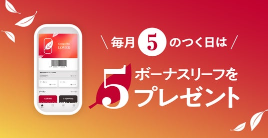 紙のポイントカードで好評をいただいていた「5のつく日」にまつわる企画を、My Gong chaでも実施します。毎月5日、15日、25日にゴンチャをご利用いただくと、購入金額に関わらず追加で5リーフをプレゼントします。ぜひ、5のつく日はゴンチャへお越しください。
