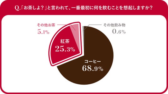10代から40代の男女を対象に『「お茶しよ?」と誘われたときに、一番初めに想起する飲み物』を聞いたところ、68.9%が「コーヒー」、25.3%が「紅茶」と回答しました。「“お茶”しよ?」という言葉にもかかわらず、約7割の人がコーヒーを想起しています。