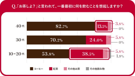 また、年代別でみると特に顕著なのは40代で、82.7%が「コーヒー」、13.5%が「紅茶」と回答し、80%以上の人がコーヒーを想起しています。一方で30代では70.2%が「コーヒー」、24.0%が「紅茶」と回答、10代~20代では53.8%が「コーヒー」、38.5%が「紅茶」と回答し、若年層になるにつれて徐々にお茶派の占める割合が増加傾向にあることも明らかになりました。
