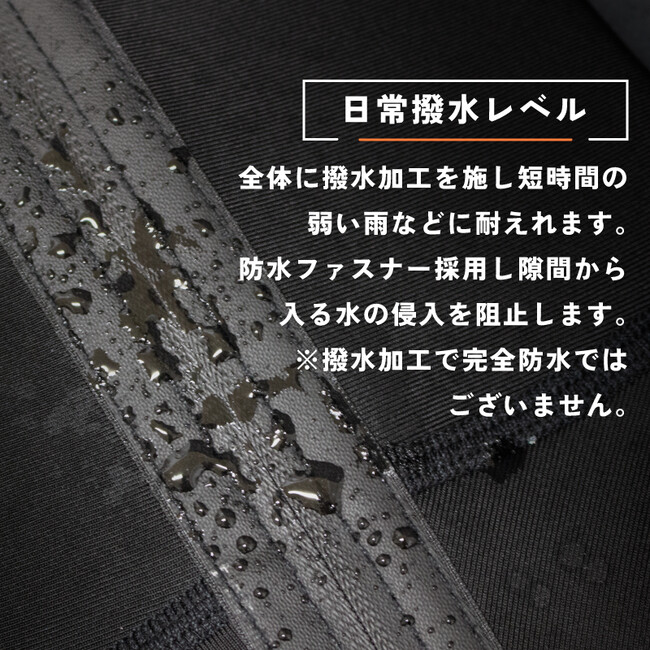 防水ファスナー採用し隙間から入る水の侵入を阻止します。