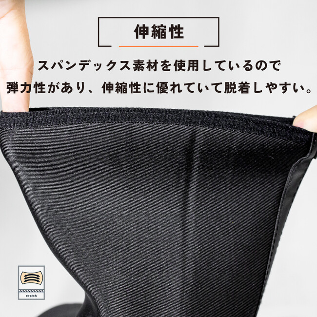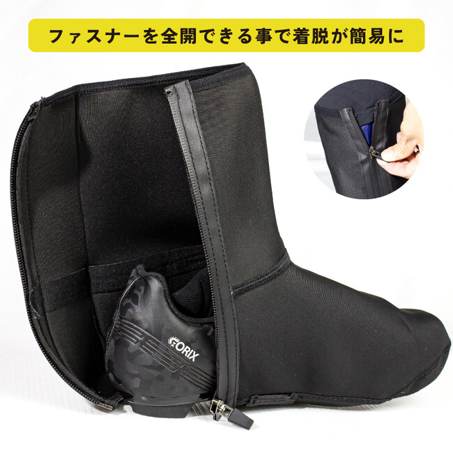 足裏部分はベルクロ式、サイドは全開するファスナーで簡単に着脱できます。