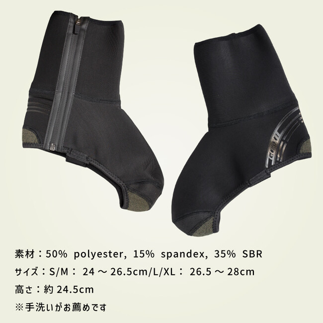 冬の寒い季節に最適な防風・防寒に保温性を兼ね備えたサイクルシューズカバーです。足裏部分はベルクロ式、サイドは全開するファスナーで、簡単に着脱できる便利な真冬の必須アイテムです。