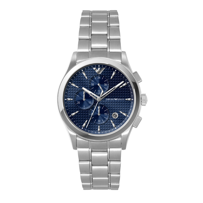 ブルーとグリーンフェイスのクロノグラフは、シルバーのステンレススチールのケースとブレスレット、クオーツ 直径42mm。再生ステンレススチールを50%以上使用したケースとブレスレットに、クロノグラフムーブメントを搭載したエンポリオ アルマーニのウォッチ。質感のあるブルーやグリーンのダイヤルが洗練された印象を醸し出します。