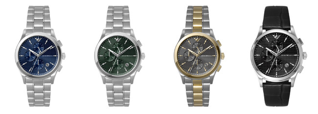 エンポリオ アルマーニでは、ブルー、グリーン、グレー、ブラックの4色のフェイスカラーで展開するクロノグラフタイプの時計をご用意しました。