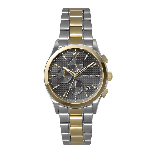 再生ステンレススチールを50%以上使用したケースとブレスレットに、クロノグラフムーブメントを搭載したエンポリオ アルマーニのウォッチ。質感のあるグレーのダイヤルとシルバー&ペールゴールドのコンビネーションがシックで上品。