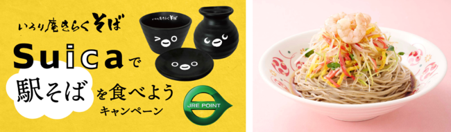 期間中、いろり庵きらく・いろり庵きらくそばにて、JRE POINT WEBサイトに登録したSuicaで1会計500円(税込)以上お支払いいただくと、抽選でSuicaのペンギン おそば3点セット、またはJRE POINT 1,000ポイントが当たります。