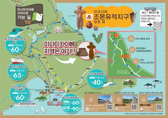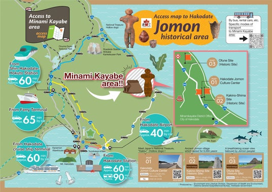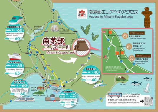 世界遺産「北海道・北東北の縄文遺跡群」の構成資産である垣ノ島遺跡や大船遺跡、国宝「中空土偶」を所蔵する函館市縄文文化交流センターの所在地である南茅部エリアへ、外国人を含む多くの観光客の来訪促進を図るため、函館のゲートウェイであるJR函館駅、新函館北斗駅、函館空港、津軽海峡フェリー、函館クルーズターミナルから南茅部エリアまでのアクセス情報を記した、日英中韓各言語ごとの多言語マップを制作し、各ゲートウェイに当該マップのパネルを設置しました。