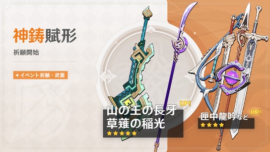 期間中、限定★5武器「両手剣・山の王の長牙」、「長柄武器・草薙の稲光」などの出現率が大幅にUPします。