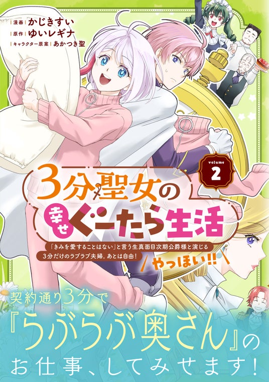 現在コミック アース・スター公式サイトにて連載中の人気作品『3分聖女の幸せぐーたら生活 「きみを愛することはない」と言う生真面目次期公爵様と演じる3分だけのラブラブ夫婦。あとは自由!やっほい!!』第2巻(漫画:かじきすい 原作:ゆいレギナ キャラクター原案:あかつき聖)を7月12日(金)に発売いたします。