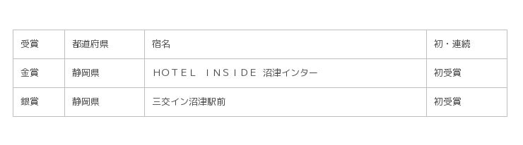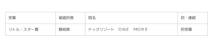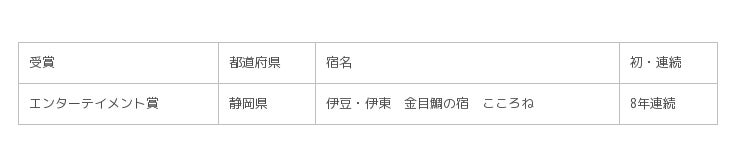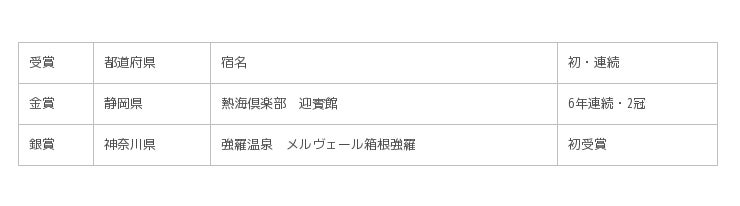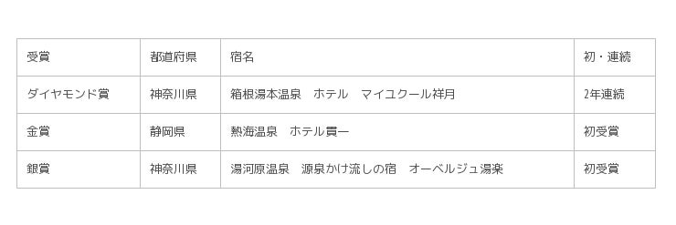 当該地区及び宿のカテゴリー別に、お客さまの声の「総合」部門において、最も高い評価を得た宿に贈られます。