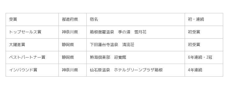 - 宿泊売上実績やお客さま評価の高い20宿を表彰、11宿が初受賞 -