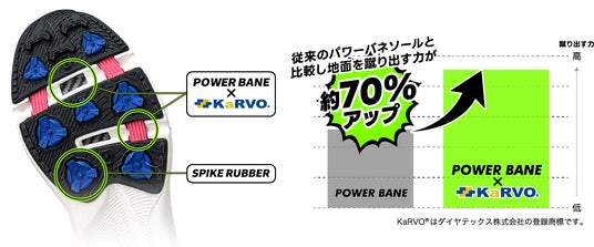 地面を強く捉え、蹴り出しの力を高めるスパイク設計とパワーバネ(R)×KaRVO(R)が生み出す爆発的な反発力で勝利を目指せ!パワーバネ(R)…ムーンスター独自開発による特殊なゴムで、その伸縮性を利用し、蹴り出す力を増大させます。
