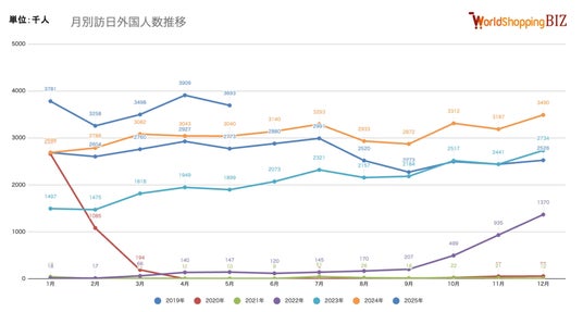 WorldShopping BIZ BLOG【図解】訪日外国人数、2025年5月は369万3,300人!5月過去最高を大幅に更新-日本政府観光局(速報):https://www.worldshopping.biz/blog/visitors-statistics-202505