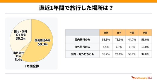 まず、 「直近1年間(2024年4月~2025年4月頃)で宿泊を伴う旅行に行った」と回答した日本・中国・アメリカ在住の20~40代男女900名を対象に「直近1年間で旅行した場所」を聞きました。