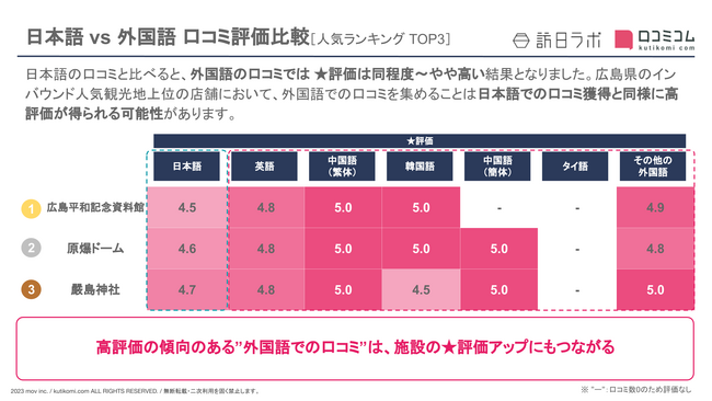 日本語の口コミと比べると、外国語の口コミでは ★評価は同程度~やや高い結果となりました。広島県のインバウンド人気観光地上位の店舗において、外国語での口コミを集めることは日本語での口コミ獲得と同様に高評価が得られる可能性があります。