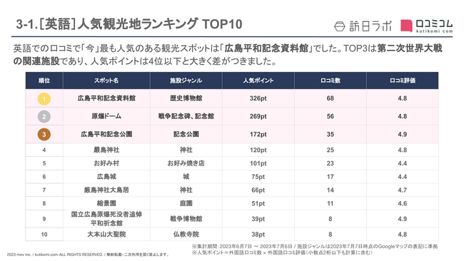 英語での口コミで「今」最も人気のある観光スポットは「広島平和記念資料館」でした。TOP3は第二次世界大戦の関連施設であり、人気ポイントは4位以下と大きく差がつきました。