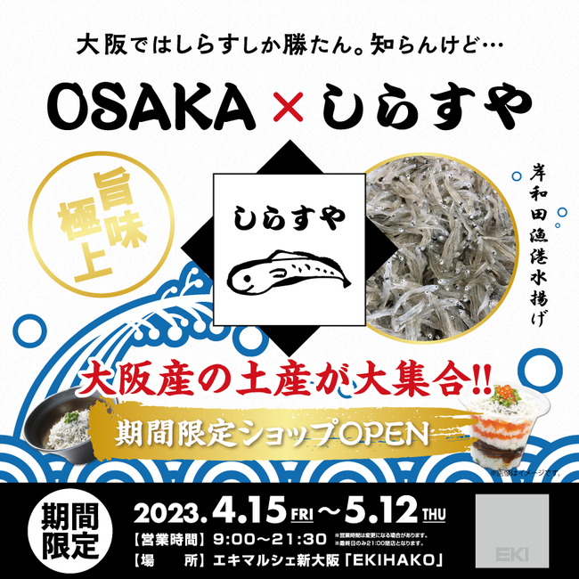 オリジナル商品の企画・制作・販売を軸に、企業・組織のトータルブランディングを手掛ける株式会社ヘソプロダクション(本社:大阪市福島区・代表取締役:稲本ミノル)は、2022年4月15日(金)から5月12日(木)までの間、大阪岸和田漁港で水揚げされた「大阪産釜揚げしらす」の「しらすや」の商品をはじめ、大阪産の土産アイテムが大集合するポップアップショップ『大阪ではしらすしか勝たん。知らんけど… OSAKA × しらすや』を、エキマルシェ新大阪 「EKIHAKO」にて期間限定開催いたします。