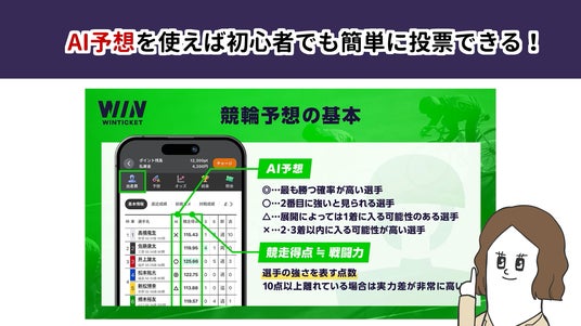 「競輪は年中無休」「100円(100pt)から投票可能」「15分おきにレース開催」「選手が5人~9人で予想しやすい」といった特長や、AI予想機能など初心者でも楽しめるポイントをコメディの流れの中でわかりやすく紹介しています。
