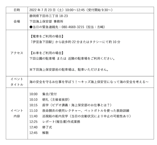 ~キッズ海上保安官になって海の安全を考える~2022年7月23日(土)10:00~ 受付:9:30~