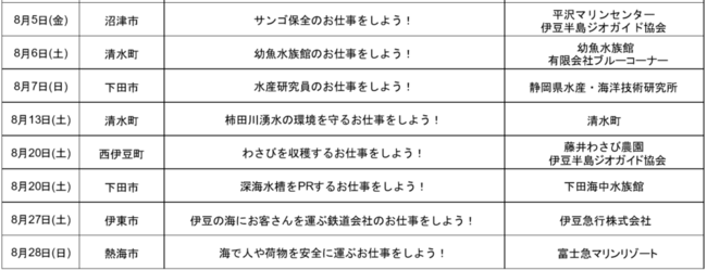 なお「海のお仕事体験 こどもわーく夏祭りin伊豆半島」は、一般社団法人地域みらい創造センターが主催するもので、次世代へ海を引き継ぐために、海を介して人と人とがつながる日本財団 海と日本プロジェクトの一環です。