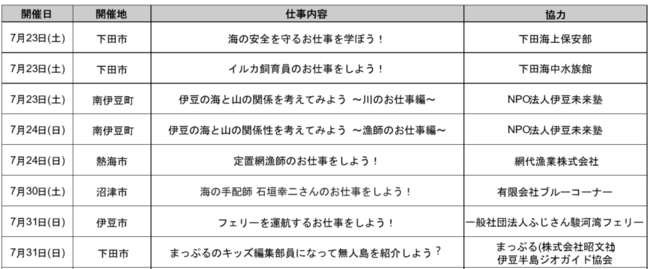 「こどもわーく夏祭りin伊豆半島」では、伊豆半島における「海のお仕事」に焦点をあて、各地の地域事業者と連携し、伊豆半島各所で全16本のお仕事体験イベントを7月~8月の期間内に実施します。「海を伝える」「食を支える」「観光を支える」「海の恵みを支える」「人や物を運ぶ」「海の安全を守る」など、伊豆の様々な地域に根付く、多様なお仕事の体験事業を実施します。お仕事体験の内容などの詳細は、特集ページ等で公開しています。