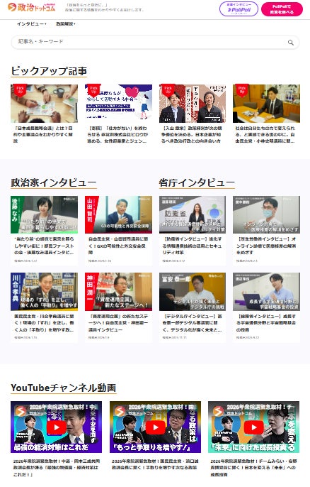 『政治ドットコム』(https://say-g.com/)は、これまで約190名(2026年4月末時点)の政治家や省庁、自治体関係者へのインタビューを通じて複雑な政策を紐解き、記事やYouTube動画でお届けしてきました。