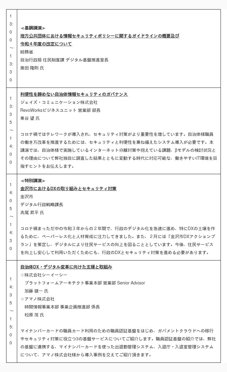 自治体の情報セキュリティの見直しと強化はますます重要度が増す一方、業務改革の弊害にもなりかねず、各地では試行錯誤が続いています。今回の自治体DXセミナーでは、3月に改定されたばかりのセキュリティポリシーガイドラインについて総務省の奥田様より解説いただくとともに、各登壇者からは業務効率化とセキュリティを両立させた全国自治体での優良事例を具体的に紹介いただきます。日々更新される情報セキュリティの最新情報が詰まっており、自治体のDXに携わり、特に情報セキュリティに関係する皆様にとっては必見の内容となっております。