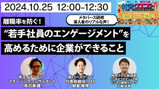 中京テレビ放送株式会社(愛知県名古屋市中村区、代表取締役社長:伊豫田祐司、以下:中京テレビ)は、2024年10月25日(金)12:00~12:30に「離職率を防ぐ! “若手社員のエンゲージメント”を高めるために企業ができること」をテーマにウェビナーを開催します。(詳細はこちらから:https://jinjibu.jp/seminar/detl/125820/)