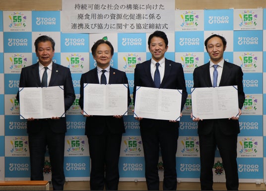 日揮ホールディングス株式会社(代表取締役会長兼社長CEO:佐藤 雅之、以下「日揮HD」)、株式会社レボインターナショナル(代表取締役CEO:越川 哲也、以下「レボインターナショナル」)および合同会社SAFFAIRE SKY ENERGY(代表者:高田 岳志、以下「SAFFAIRE SKY ENERGY」)は、愛知県東郷町(町長:石橋 直季)ならびに中部国際空港株式会社(代表取締役社長:籠橋 寛典、以下「中部国際空港」)と持続可能な航空燃料SAF(Sustainable Aviation Fuel、以下「SAF」)等の原料となる使用済み食用油(以下「廃食用油」)の資源化促進を図るため、「持続可能な社会の構築に向けた廃食用油の資源化促進に係る連携及び協力に関する協定」(以下「本協定」)を本年2月16日に締結しましたのでお知らせします。また、同日に東郷町役場で石橋 直季町長ご参加のもと本協定締結式を執り行いました。