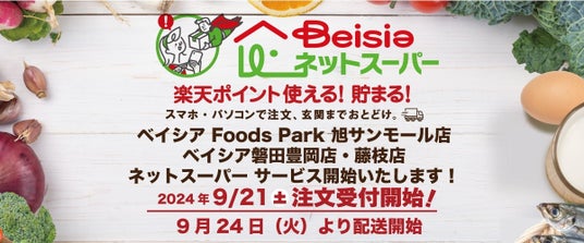 株式会社ベイシア(本社:群馬県前橋市、代表取締役社長:相木孝仁)は、楽天グループ株式会社(以下「楽天」)が提供するネットスーパーのプラットフォーム「楽天全国スーパー」内に出店する「ベイシアネットスーパー」において、ベイシアフードセンター磐田豊岡店・ベイシアスーパーマーケット藤枝店、ベイシア Foods Park 旭サンモール店からの配送を2024年9月24日(火)より開始いたします。