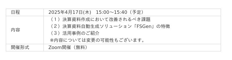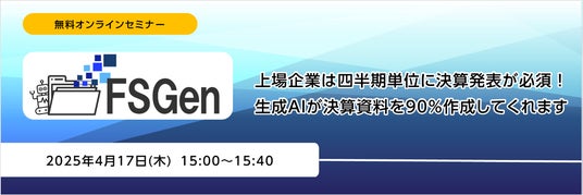 株式会社ニーズウェル(本社:東京都千代田区、代表取締役会長兼社長 船津浩三)は、2025年4月17日(木)15時より、無料オンラインセミナー「決算資料自動生成ソリューション「FSGen」 ~上場企業は四半期単位に決算発表が必須!生成AIが決算資料を90%作成してくれます~」を開催します。