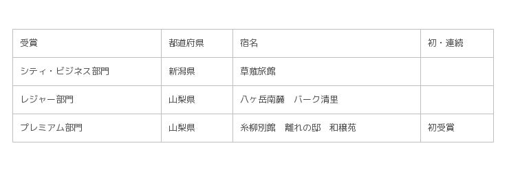 当該地区及び宿のカテゴリー別に、お客さまの声の「総合」部門において、最も高い評価を得た宿に贈られます。