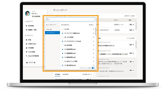 「SmartHR」にログインした従業員の業務の入口になる機能です。各種手続きに関する申請業務や社内のお知らせ確認のほか、IdP機能を通じた外部アプリケーションへのスムーズなログインなど、さまざまな業務を集約し情報収集時間の削減や社内のタイムリーな情報共有を叶え、従業員と人事・労務担当者の生産性向上に貢献します。