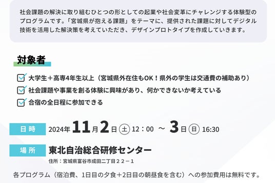 合宿費用・交通費(宮城県外からの参加者に限る・上限2万円)が支給され、参加者の負担少なくご参加いただけます。宮城県内・県外の起業に興味がある方・起業仲間を募集している方など、ぜひご応募お待ちしています。