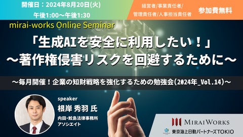 株式会社みらいワークス(本社:東京都港区、代表取締役社長 岡本 祥治、以下「当社」)は、2024年8月20日(火)生成AI利用時の著作権回避対策について、弁護士法人内田・鮫島法律事務所 根岸 秀羽 氏を迎え、オンラインセミナーを開催します。