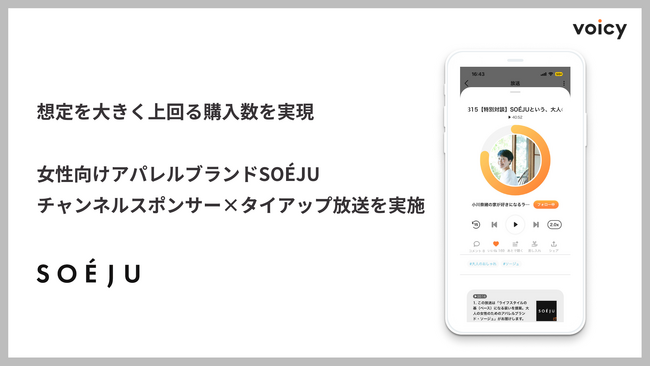 「Voicy Branding Program」を導入したD2Cファッションブランド「SOEJU(ソージュ)」を展開するモデラート社がおこなったのは、チャンネルスポンサープランとタイアップ放送を組み合わせたメニューです。当初からソージュの愛用者であるパーソナリティ・小川奈緒さんのチャンネル「小川奈緒の家が好きになるラジオ」のコミュニティに賛同するスポンサーとなり、パーソナリティによるスポンサーコールのほか、小川さんとソージュ担当者の対談をタイアップ放送することでブランドの想いを深く届け、想定購入数を大きく上回る効果を実現しました。企業ブランドがチャンネルスポンサーとしてチャンネルコミュニティに賛同しているからこそ受け入れられ、タイアップ放送で購入まで獲得することができた、まさにトライブマーケティングの成功事例です。パーソナリティが築くコミュニティを企業ブランドが応援するこの仕組みが、リスナーに受け入れられたことが明らかになりました。