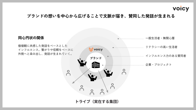 ソーシャルメディアの普及でタッチポイントが増えた一方で、生活者自身が情報を取捨選択するようになり、それぞれ価値観の合う選択をできることが満足度につながっていると言えます。そもそもライフスタイルの多様化が進んだことで、市場のなかで年齢や性別、職業、居住地などをターゲット設定しても、虚像になってしまいがちです。そこで、共通の価値観をもつトライブ(実在する集団)に焦点を置き、その中心から広げていくことがマーケティングコミュニケーションの最大化につながると考えました。トライブの中心には高い熱量が存在し、周囲にその熱量を伝播する力があります。企業やブランドがその価値観に共感しトライブを応援することで、トライブの理解者として身を置くことができます。その立ち位置が築ければトライブにとっては仲間となり、企業やブランドが発信する情報を選択する対象となります。賛同を継続することで受け入れられやすくなると同時に、賛同に対する感謝が芽生えます。いわゆる同心円状の関係となり、これが、“ありがとうと言われる広告”につながります。Voicyには、そういった熱量の高い共通の価値観をもつトライブ=パーソナリティによるチャンネルコミュニティが数多く存在します。それは、ありのままの想いや人となりを届けられる音声だからこそ生まれるトライブです。Voicyが提供する法人向けブランドソリューションでは、トライブマーケティングを通じて企業活動への共感の和を広げています。