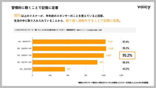 リスナーの95%以上が半年後もスポンサーを記憶。繰り返し聴くほど好感度が上昇する“嫌われない広告”が実現。