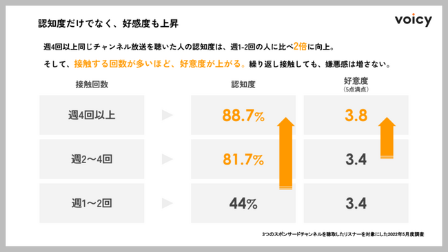 「Voicy Branding Program」のプランのひとつであるチャンネルスポンサーでは、放送のたびにパーソナリティが自らの声で企業やサービスを紹介するスポンサーコールを導入します。リスナーへの調査によると、リスナーの95%以上が半年前のスポンサーについて覚えていると回答、記憶が定着していることがわかりました。また、実際に同じスポンサーコールのついたチャンネルの放送を週4回以上聴いた人の認知度は、週1-2回の人に比べて2倍に向上しています。さらに、接触する回数が多いほど好意度が上がることがわかっています。繰り返し聴くほど好感度が上昇する“嫌われない広告”が実現しており、ブランディングを考える企業に好評です。